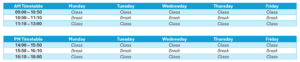 Please note: Morning classes start at 09.00hrs. Afternoon classes start at 14.00hrs.